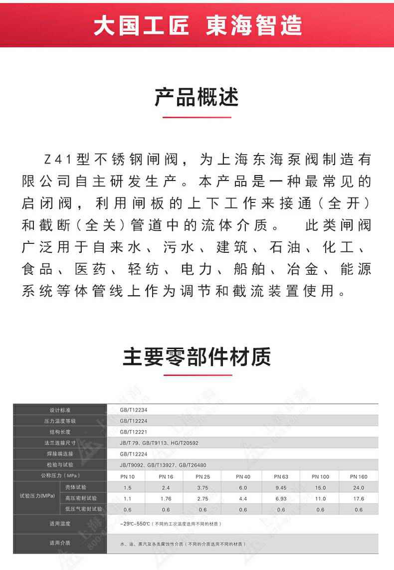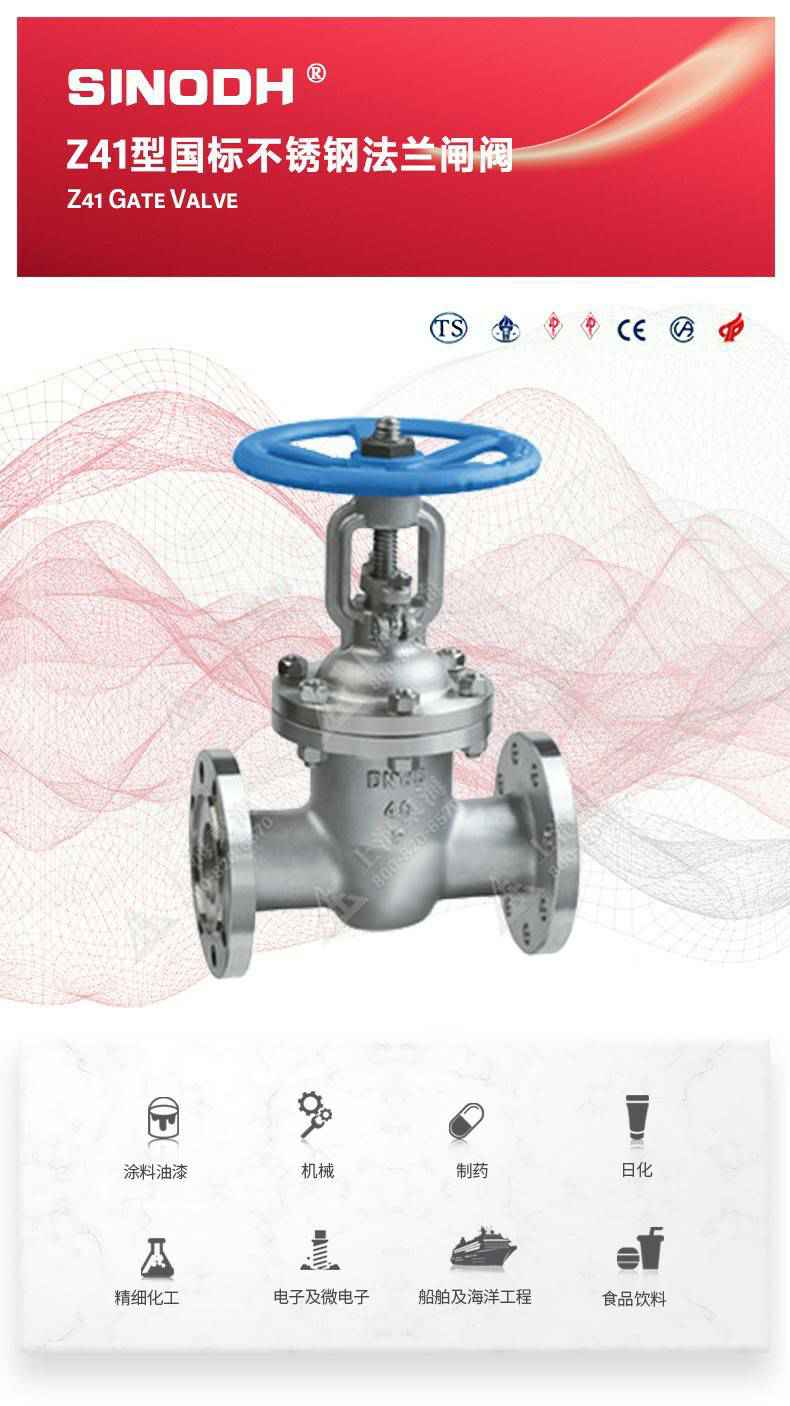 Z41型不锈钢闸阀,为亚美体育在线(中国)官方网站自主研发生产。本产品是一种最常见的启闭阀,利用闸板的上下工作来接通(全开)和截断(全关)管道中的流体介质。此类闸阀广泛用于自来水、污水、建筑、石油、化工、食品、医药、轻纺、电力、船舶、冶金、能源系统等体管线上作为调节和截流装置使用。