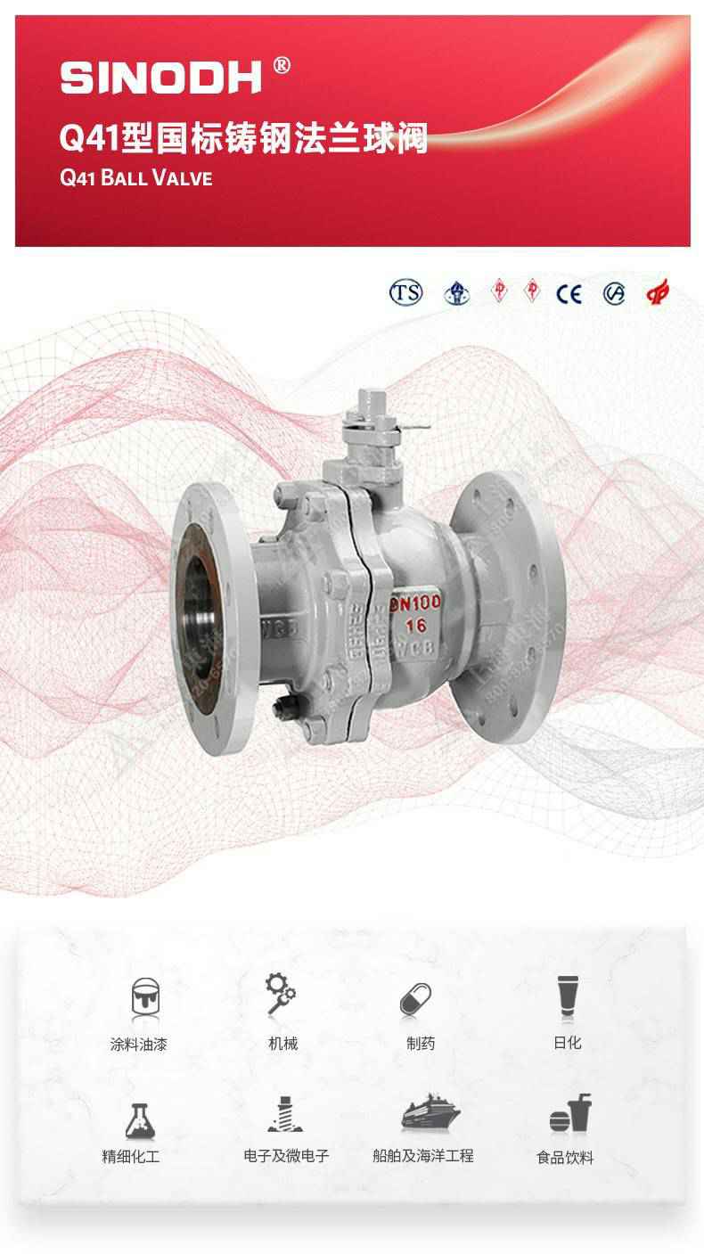 Q41型国标铸钢法兰球阀,为亚美体育在线(中国)官方网站自主研发生产。本产品设计制造标准符合GB/T12237、GB/T12224标准。该产品的球体在介质压力作用下球体能产生一定的位移并紧压在出口端的密封面上,保证出口端密封。适用于水、溶剂、酸和天然气等一般工业介质也适用于工况恶劣的介质,如氧气、过氧化氢、甲烷和乙烯等介质。